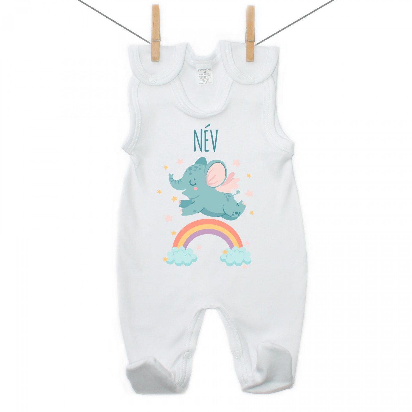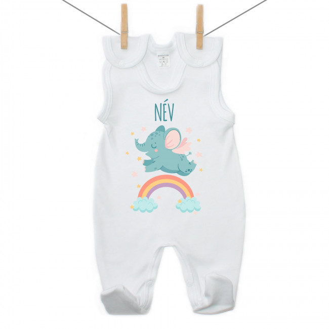 A vállpántokon és a lábak között található patent megkönnyíti az öltöztetést és a pelenkacserét. 50-től 86 cm-es méretig kapható.